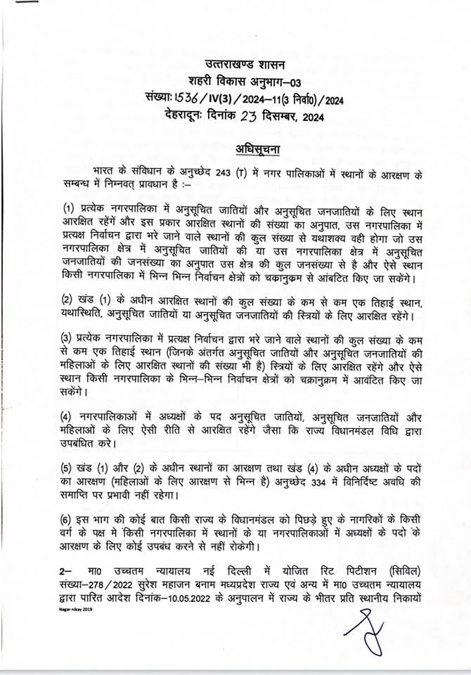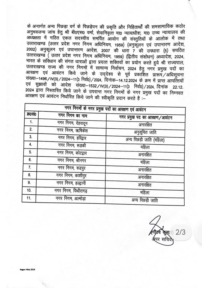 नगर निगमों के मेयर पदों की आरक्षण एवं आवंटन सूची।