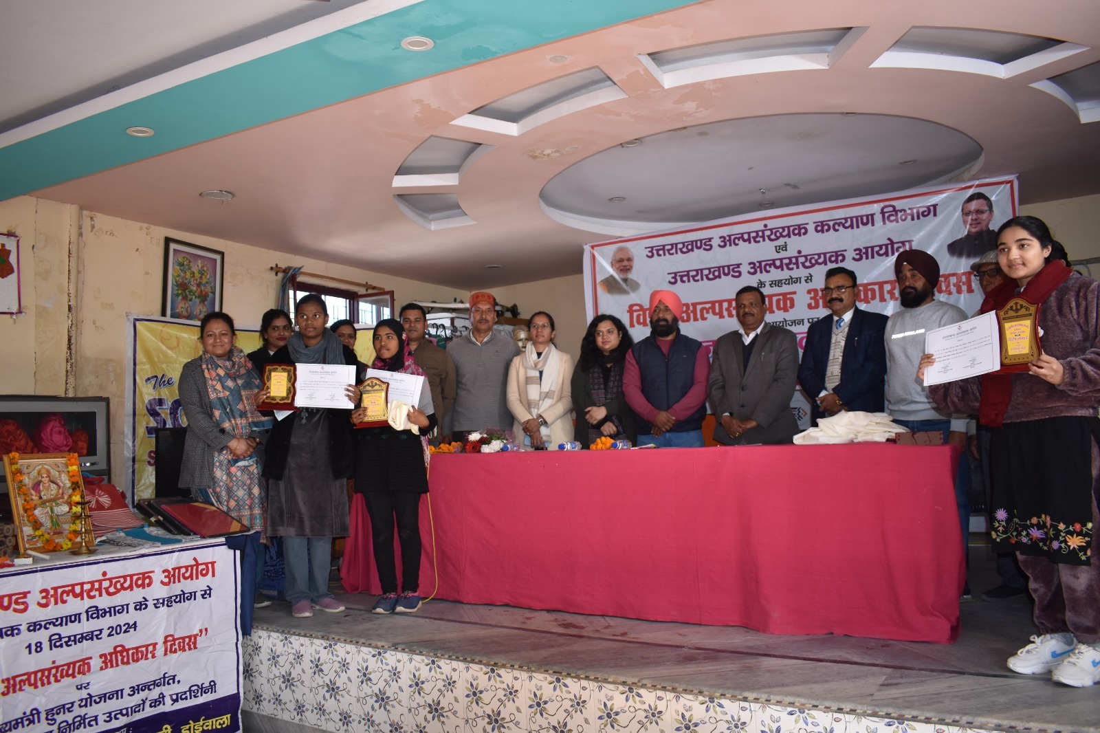 स्थान डोईवाला मेें साफ्टोªनिक्स सोशल वेलफेयर सोसाइटी के सभागार में विश्व अल्पसंख्यक अधिकार दिवस का आयोजन किया गया। जिसमेें मुख्य अतिथि के रूप में श्री राजेन्द्र कुमार निदेशक, अल्पसंख्यक कल्याण, उत्तराखण्ड के सानिध्य में जन-जागरूकता कार्यक्रम किया गया। कार्यक्रम में श्री जगदीश सिंह रावत, सचिव, उत्तराखण्ड अल्पसंख्यक आयेाग द्वारा मा0 आयेाग के कृत, एवं अल्पसंख्यक कल्याण की योजनाअेां के सम्बन्ध में विस्तृत रूप से जानकारी दी गयीं। श्री परमिन्दर सिंह सदस्य अल्पसंख्यक आयेाग द्वारा मा0 आयेाग के कृत तथा सरकार द्वारा चलायी जा रही विभिन्न कल्याणकारी योजनाओं , जेैसे कि गुरूद्वारों का सौदर्याकरण, ईदगाह, रास्तों का निर्माण, आदि पर सरकार की उपलब्धि बतायी गयी है। निदेशक, अल्पसंख्यक कल्याण द्वारा केन्द्र व राज्य सरकार की विभिन्न योजनाएं, जो कि अति महत्तवपूर्ण है, जिसकों गॉव के अन्तिम छोर तक पहुॅचाना है। योजनाओं का लाभ लेने हेतु जिला अल्पसंख्यक कार्यालय, व निदेशक, अल्पंसख्यक कल्याण विभाग के स्तर से भी लाभ प्राप्त किया जा सकता है। विशेषकर मा0 मुख्यमंत्री हुनर योजना, मा0 मुख्यमंत्री प्रोत्साहन योेजना, मुख्यमंत्री अल्पसंख्यक प्रोंत्साहन योजना आदि योजना पर विस्तृत चर्चा करते हुए जागरूक किया गया। बैठक में उपस्थित अतिथिगण श्री निर्मल दास व स्वामी लेाकेश दास जी द्वारा अल्पसंख्यक समुदाय को जागरूक करते हुए अवगत कराया गया कि सरकार द्वारा चलाई गयी योजनाओं का लाभ आवश्यक प्राप्त करना चाहिए। कार्यक्रम की अध्यक्षता साफ्टोªनिक्स सोशल वेलफेयर सोसाइटी के संचालक श्री हरिवन्दर सिंह की अध्यक्षता में किया गया। कार्यक्रम प्रदेश के समस्त जनपदों में किया गया। कार्यक्रम में मुख्यमंत्री अल्पसंख्यक मेधावी बालिका प्रोत्साहन योजनान्तर्गत बालिकाओं को सम्मानित किया गया। जिसमें हाईस्कूल में कु0 महक मलिक द्वारा 88.20 प्रतिशत व कु0 शुमैय्या द्वारा 95.40 अंक प्राप्त किये गये। वहीं इण्टरमीडिएट में कु0 सायरा द्वारा 91.40 व कु0 अमीश प्रवीन द्वारा 90.00 प्रतिशत अंक प्राप्त किये गये। साथ ही मुख्यमंत्री हुनर येाजना के अन्तर्गत सफल प्रािक्षणार्थी/लाभार्थियों को कोशल विकास के अन्तर्गत सफल स्वरोजगार में खरे उतरने पर सुश्री सिया सैनी, श्रीमती अफरोज, जहीर अहमद, रमनीक सिंह, नासिर अहमद को सम्मानित किया गया। कार्यक्रम में अल्पंसख्यक समाज के अधिक से अधिक लोगों द्वारा भाग लिया गया। कार्यक्रमें हरविन्दर ंिसंह संस्था के अध्यक्ष, नरेन्द सिंह नेेगी, कार्यक्रम के संचालक, व मण्डल अध्यक्ष भाजपा, राजेन्द्र तड़ियाल जी, हिमाशु चमोली, मनप्रीत सिंह, प्र्रेम सिंह, सुन्दर लोधी, अवतार सिंह, मदन सिंह, जमीर अहमद,मनोज ंिसह भण्डारी, ज